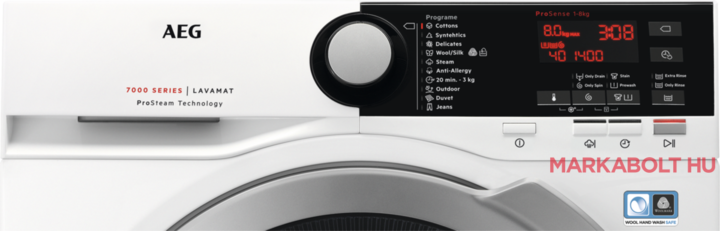 | Fontosabb programok | Pamut, Műszál, Kímélő, Gyapjú/Selyem, Gőzölés (Pamut/Műszál), Anti-allergén, 3 kg - 20 perc, Outdoor, Takaró, Farmer, Öblítés, Szívattyúzás, Centrifugálás |