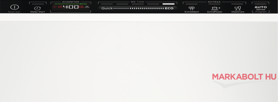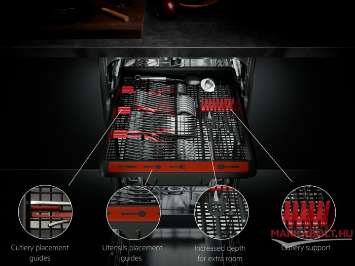 Pakolhatóságban is kiemelkedő: a felső kosár megpakolva is könnyen állítható, a MaxiFlex fiók pedig kifejezetten kényelmes az evőeszközöknek és nagyobb, furcsa formájú konyhai eszközöknek is (kivehető fiókosztóval, késtartóval). A TimeBeam funkció a hátralévő időt a padlóra vetíti, így ránézésre látod, hol tart a program, a belső világítás pedig segít, ha este pakolsz ki/be. A vezérlés gyors: QuickSelect, LED-es idővisszajelzés, késleltetett indítás (1–24 óra), AutoOff, só- és öblítőszer kijelzés mind adott.